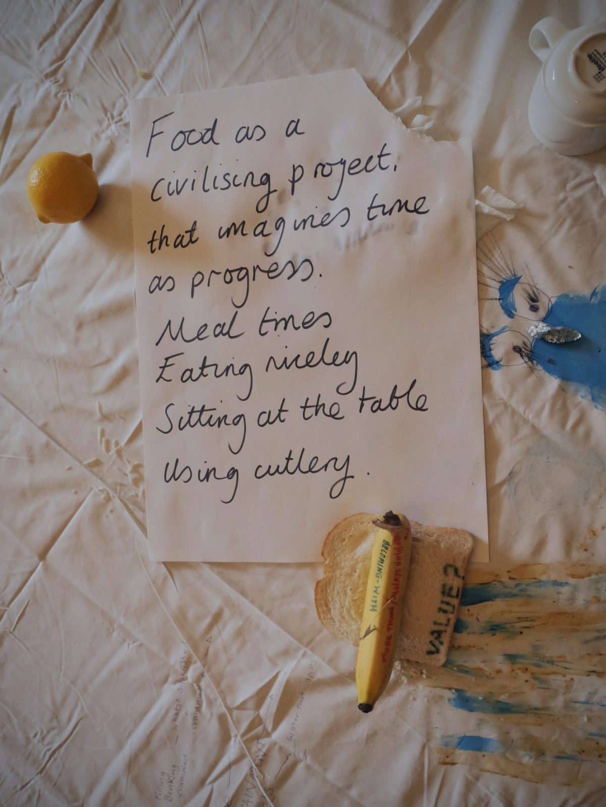 Time, as we have noted through this project, is bound up with notions of progress and the linearly developing child. Within this, feeding can often be viewed as a ‘civilising’ project – where the young child must be shaped to behave in a more ‘civilised’ way as time passes, by being encultured to ‘eat nicely’ (Albon and Hellman, 2019; Nxumalo et al, 2011). Practices such as partitioning food time off from other times of the day (like playtime) and coupling it with specific bodily practices like sitting at the table and using cutlery – have a long and messy colonial history of being presented as natural or superior modes of feeding.